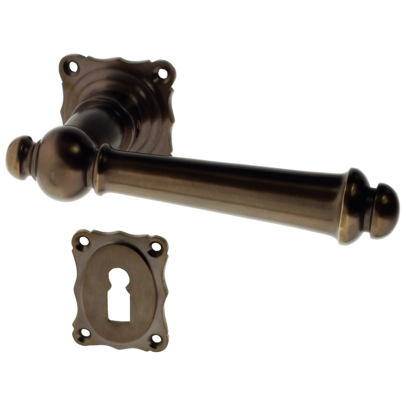 Rosettengarnitur mit Buntbart-Schlüsselloch. Egal, welchen Abstand das Schlüsselloch von der Türklinke hat, diese Garnitur passt in jedem Fall auch an Ihre historische Tür.