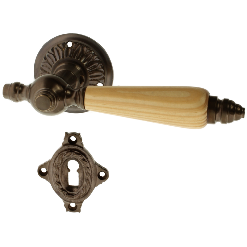 Rosettengarnitur mit Buntbart-Schlüsselloch. Egal, welchen Abstand das Schlüsselloch von der Türklinke hat, diese Garnitur passt in jedem Fall auch an Ihre historische Tür.