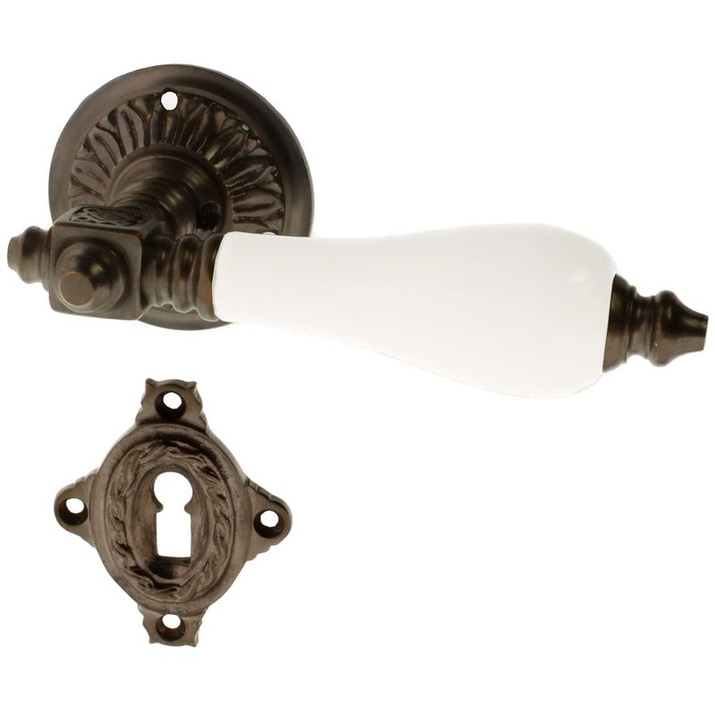 Rosettengarnitur mit Buntbart-Schlüsselloch. Egal, welchen Abstand das Schlüsselloch von der Türklinke hat, diese Garnitur passt in jedem Fall auch an Ihre historische Tür.