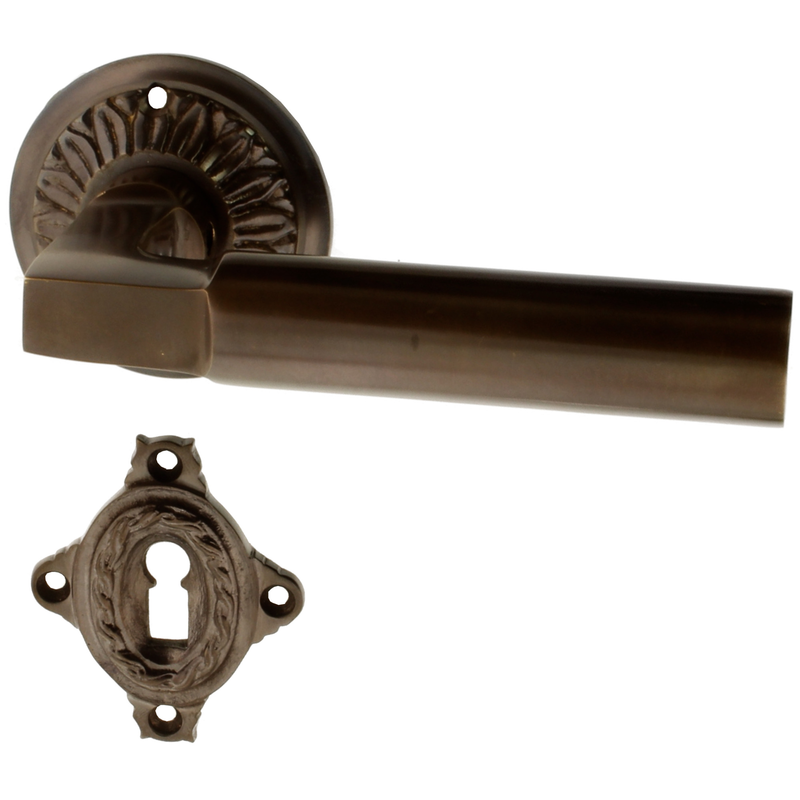 Rosettengarnitur mit Buntbart-Schlüsselloch. Egal, welchen Abstand das Schlüsselloch von der Türklinke hat, diese Garnitur passt in jedem Fall auch an Ihre historische Tür.