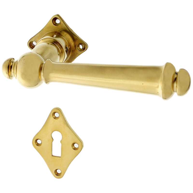 Rosettengarnitur mit Buntbart-Schlüsselloch. Egal, welchen Abstand das Schlüsselloch von der Türklinke hat, diese Garnitur passt in jedem Fall auch an Ihre historische Tür.