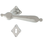 Rosettengarnitur mit Buntbart-Schlüsselloch. Egal, welchen Abstand das Schlüsselloch von der Türklinke hat, diese Garnitur passt in jedem Fall auch an Ihre historische Tür.