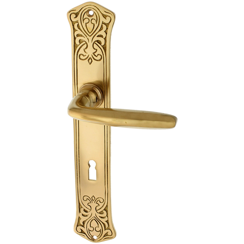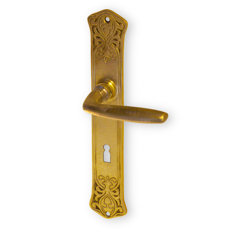 Historischer Jugendstil Türbeschlag mit üppig dekoriertem Langschild und schlichtem Türgriff - Modell "Wittstock P" - aus patiniertem Messing