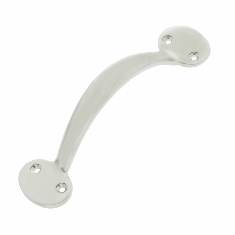 Klassischer Möbelgriff - auch als Schleifengriff oder Schrankschleife bezeichnet - aus matt vernickeltem Messing. Verwendbar an historischen Schubladen, Türen oder Schränken. Kein dünnes Blech, sondern gegossenes Messing, gefertigt nach geschichtlichen Vorlagen.