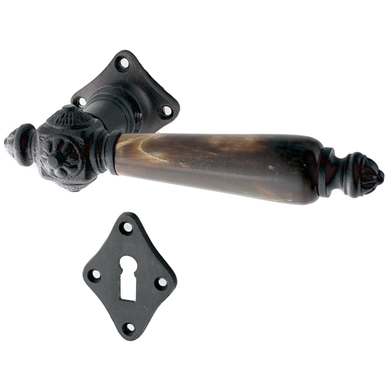 Rosettengarnitur mit Buntbart-Schlüsselloch. Egal, welchen Abstand das Schlüsselloch von der Türklinke hat, diese Garnitur passt in jedem Fall auch an Ihre historische Tür.