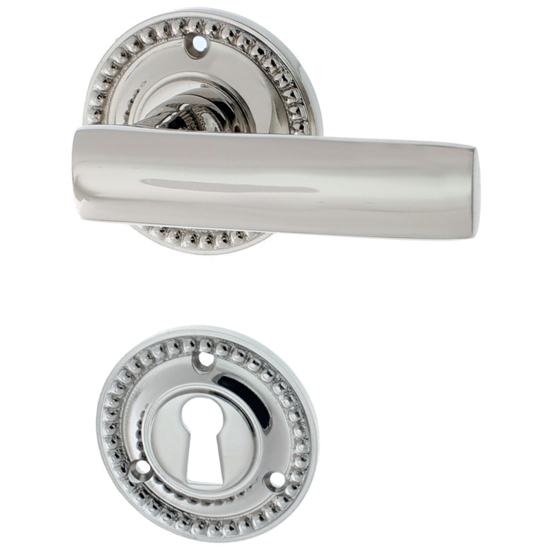 Rosettengarnitur mit Buntbart-Schlüsselloch. Egal, welchen Abstand das Schlüsselloch von der Türklinke hat, diese Garnitur passt in jedem Fall auch an Ihre historische Tür.