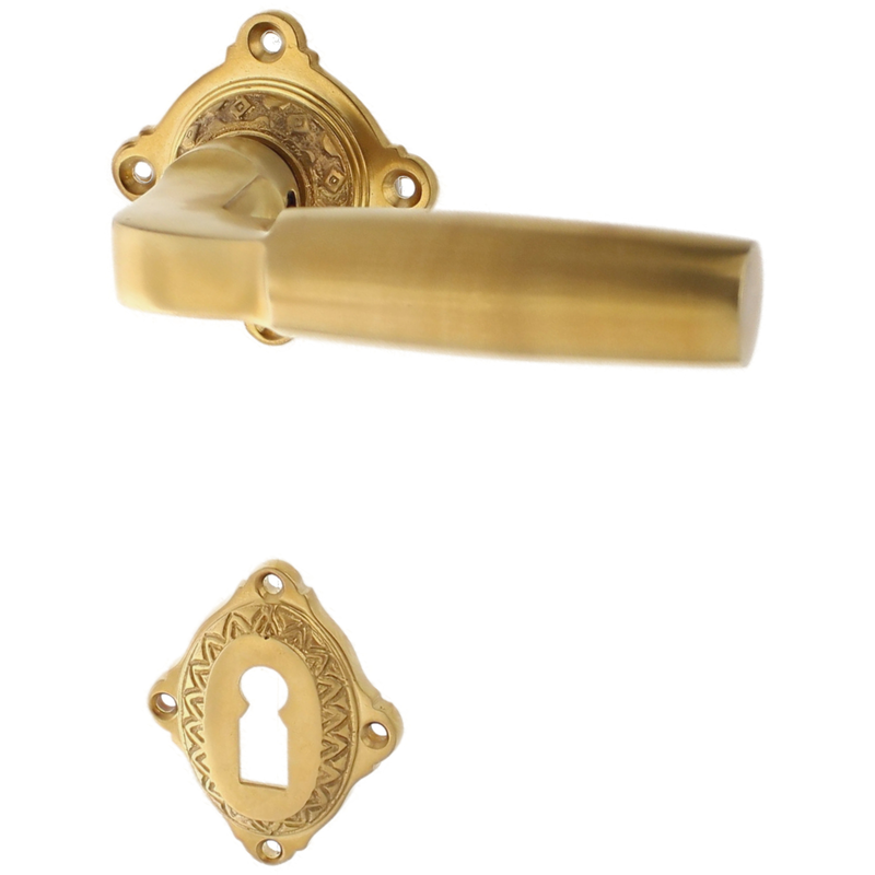 Rosettengarnitur mit Buntbart-Schlüsselloch. Egal, welchen Abstand das Schlüsselloch von der Türklinke hat, diese Garnitur passt in jedem Fall auch an Ihre historische Tür.