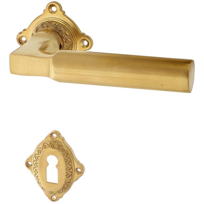 Rosettengarnitur mit Buntbart-Schlüsselloch. Egal, welchen Abstand das Schlüsselloch von der Türklinke hat, diese Garnitur passt in jedem Fall auch an Ihre historische Tür.
