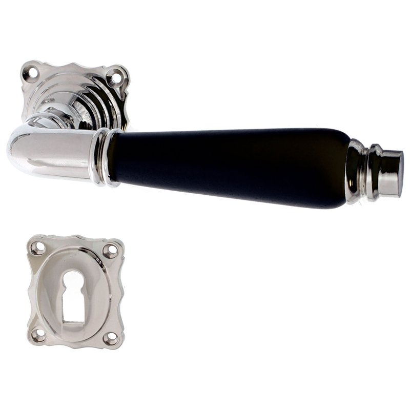 Rosettengarnitur mit Buntbart-Schlüsselloch. Egal, welchen Abstand das Schlüsselloch von der Türklinke hat, diese Garnitur passt in jedem Fall auch an Ihre historische Tür.