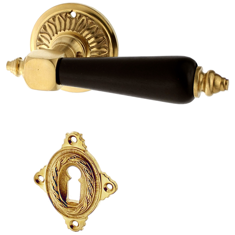 Rosettengarnitur mit Buntbart-Schlüsselloch. Egal, welchen Abstand das Schlüsselloch von der Türklinke hat, diese Garnitur passt in jedem Fall auch an Ihre historische Tür.