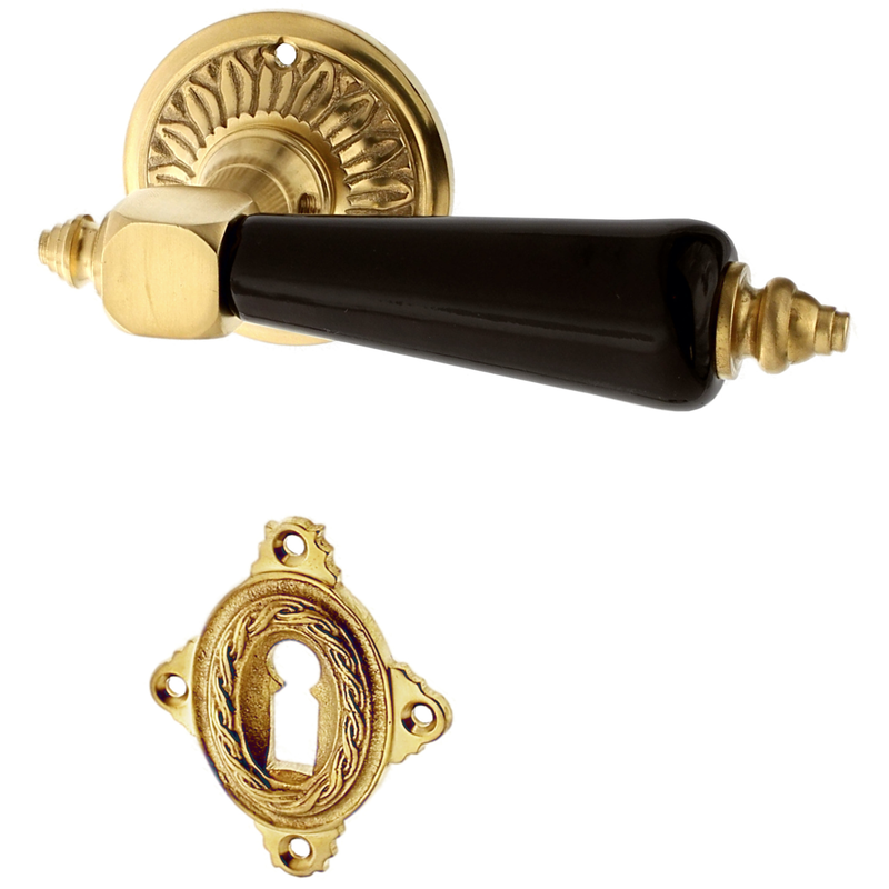 Rosettengarnitur mit Buntbart-Schlüsselloch. Egal, welchen Abstand das Schlüsselloch von der Türklinke hat, diese Garnitur passt in jedem Fall auch an Ihre historische Tür.