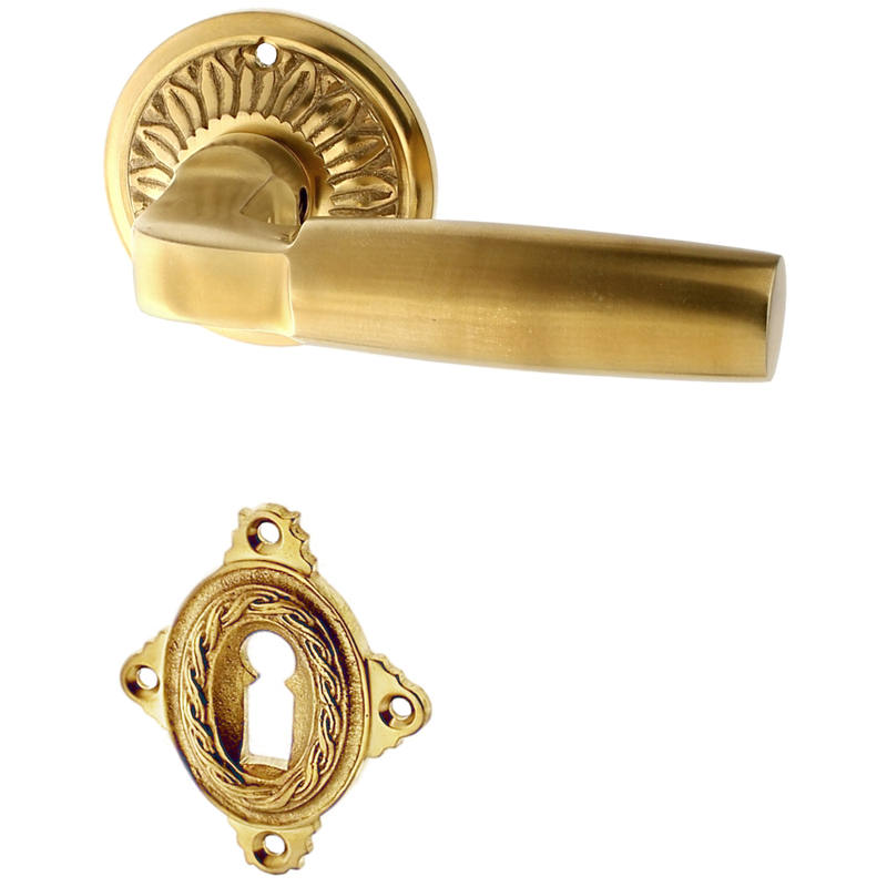 Rosettengarnitur mit Buntbart-Schlüsselloch. Egal, welchen Abstand das Schlüsselloch von der Türklinke hat, diese Garnitur passt in jedem Fall auch an Ihre historische Tür.