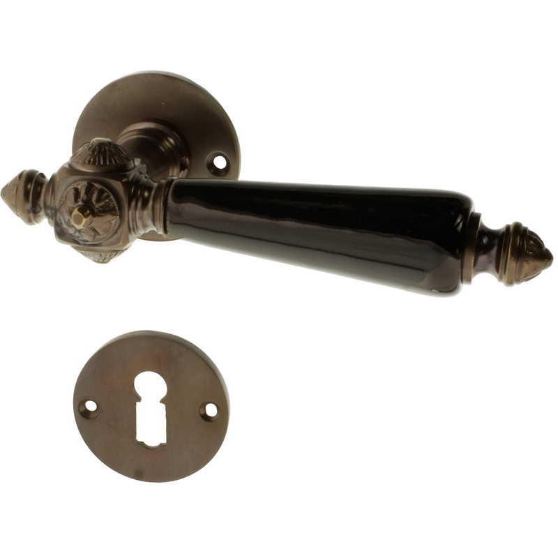 Rosettengarnitur mit Buntbart-Schlüsselloch. Egal, welchen Abstand das Schlüsselloch von der Türklinke hat, diese Garnitur passt in jedem Fall auch an Ihre historische Tür.