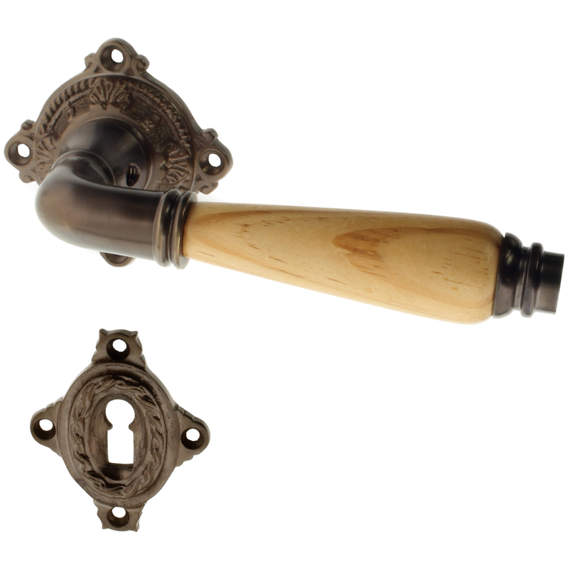 Rosettengarnitur mit Buntbart-Schlüsselloch. Egal, welchen Abstand das Schlüsselloch von der Türklinke hat, diese Garnitur passt in jedem Fall auch an Ihre historische Tür.