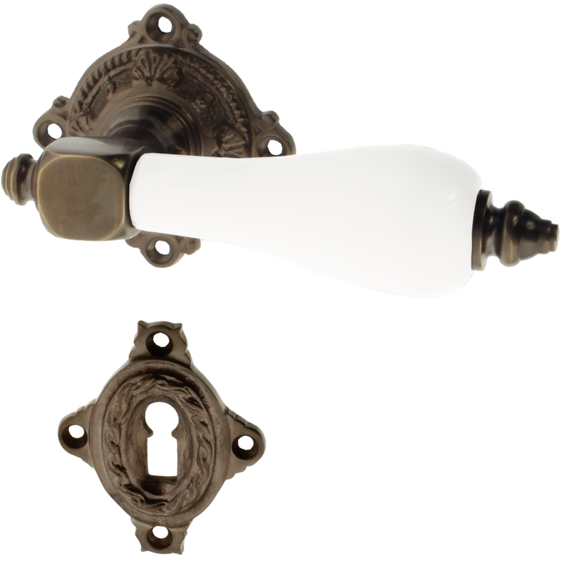 Rosettengarnitur mit Buntbart-Schlüsselloch. Egal, welchen Abstand das Schlüsselloch von der Türklinke hat, diese Garnitur passt in jedem Fall auch an Ihre historische Tür.