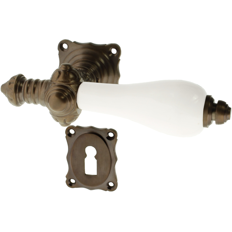 Rosettengarnitur mit Buntbart-Schlüsselloch. Egal, welchen Abstand das Schlüsselloch von der Türklinke hat, diese Garnitur passt in jedem Fall auch an Ihre historische Tür.
