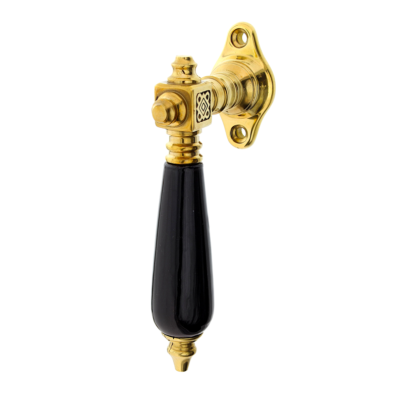 Fensterolive antik im Stil der Gründerzeit - Messing glänzend mit Griff aus Holz oder Keramik - Modell "Grünau B" - nach historischem Vorbild