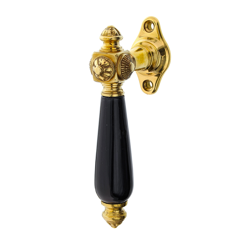 Handgemachter Fenstergriff - mit Griffhülse aus Keramik, Holz oder Horn - aus poliertem Messing - Modell "Karlshorst B"