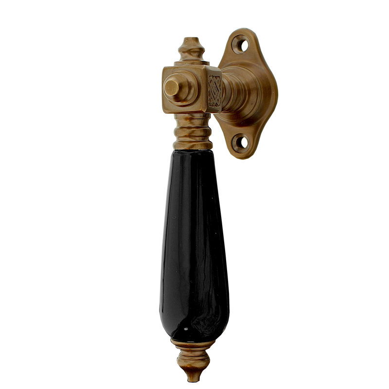 Fensterolive antik im Stil der Gründerzeit - Messing dunkel antik patiniert mit Griff aus Holz oder Keramik - Modell "Grünau A" - nach historischem Vorbild