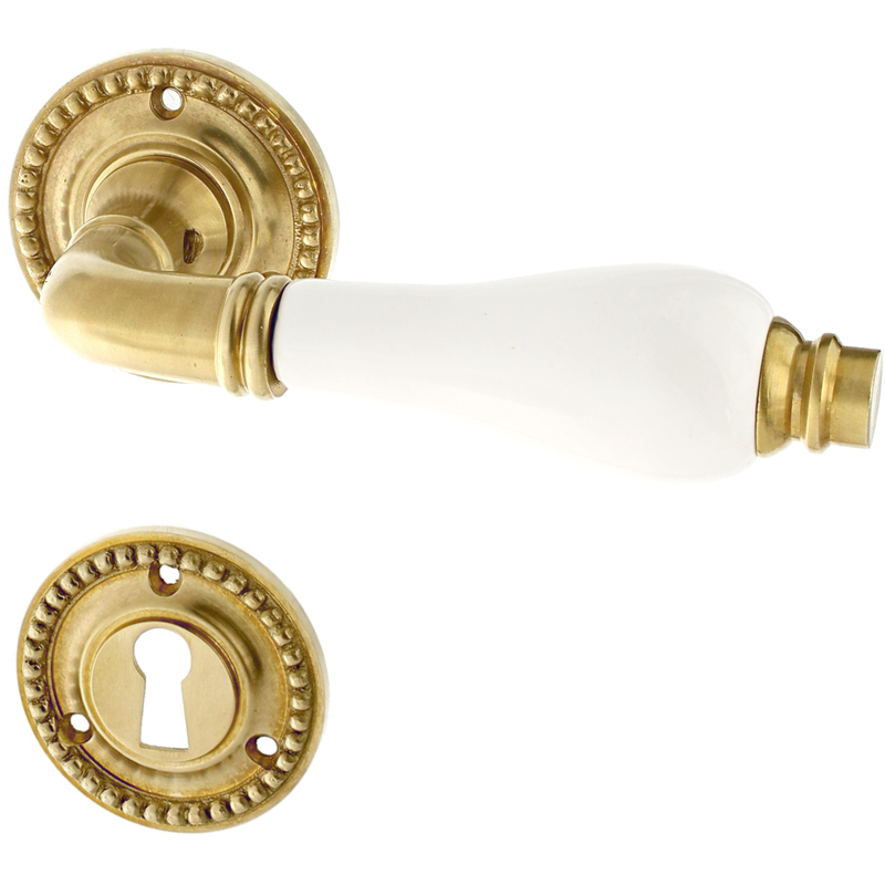Rosettengarnitur mit Buntbart-Schlüsselloch. Egal, welchen Abstand das Schlüsselloch von der Türklinke hat, diese Garnitur passt in jedem Fall auch an Ihre historische Tür.