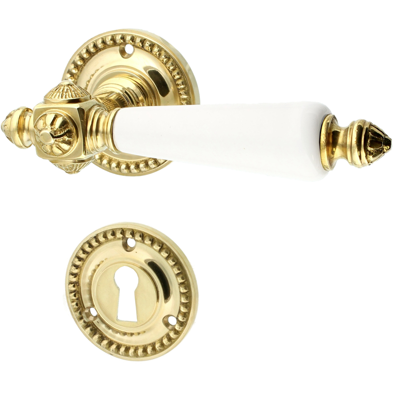 Rosettengarnitur mit Buntbart-Schlüsselloch. Egal, welchen Abstand das Schlüsselloch von der Türklinke hat, diese Garnitur passt in jedem Fall auch an Ihre historische Tür. Für WC-Verschlüsse bieten wir zusätzlich auch noch spezielle Einsteckschlösser an, falls Ihre Tür noch kein WC-Schloss hat. Schauen Sie bitte hier.
