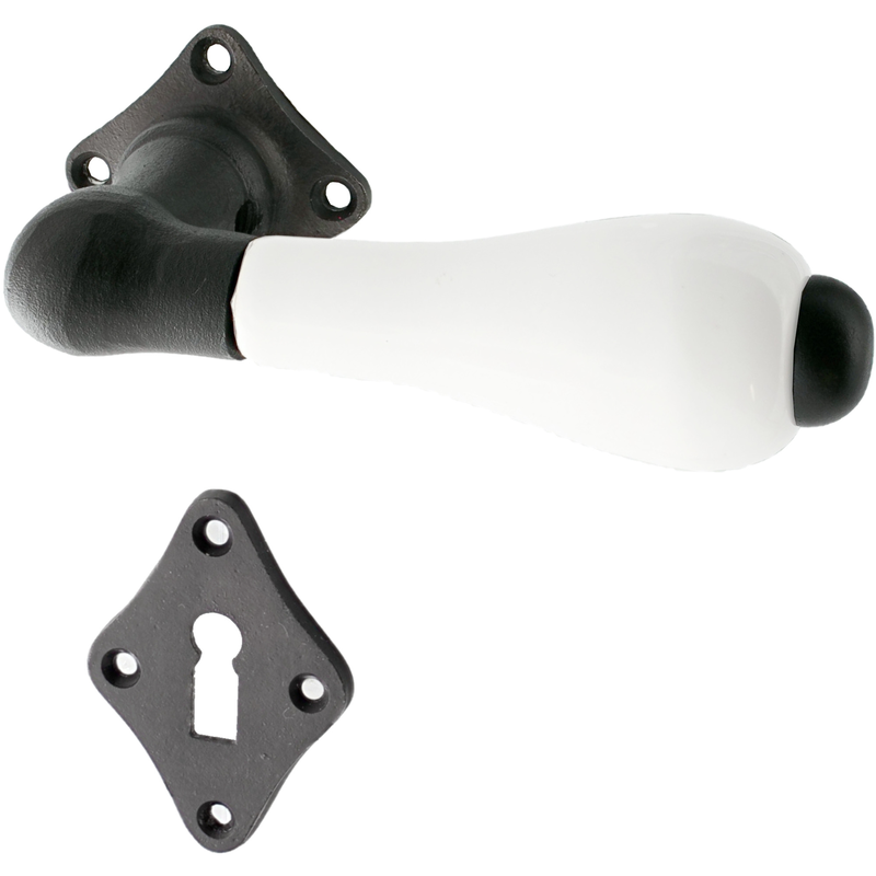 Rosettengarnitur mit Buntbart-Schlüsselloch. Egal, welchen Abstand das Schlüsselloch von der Türklinke hat, diese Garnitur passt in jedem Fall auch an Ihre historische Tür.