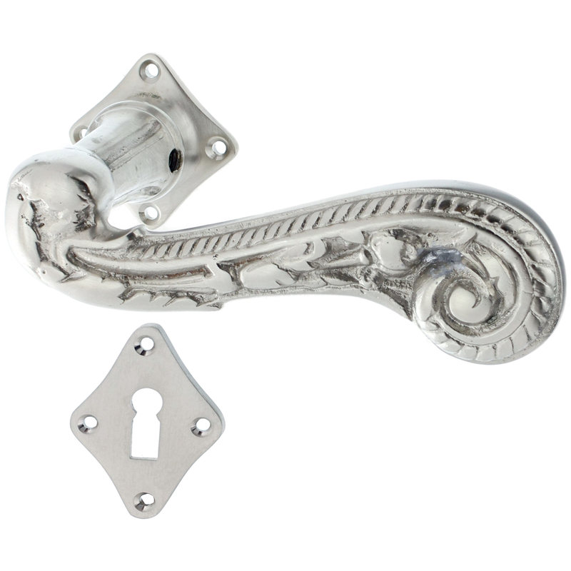 Rosettengarnitur mit Buntbart-Schlüsselloch. Egal, welchen Abstand das Schlüsselloch von der Türklinke hat, diese Garnitur passt in jedem Fall auch an Ihre historische Tür. Für WC-Verschlüsse bieten wir zusätzlich auch noch spezielle Einsteckschlösser an, falls Ihre Tür noch kein WC-Schloss hat. Schauen Sie bitte hier.