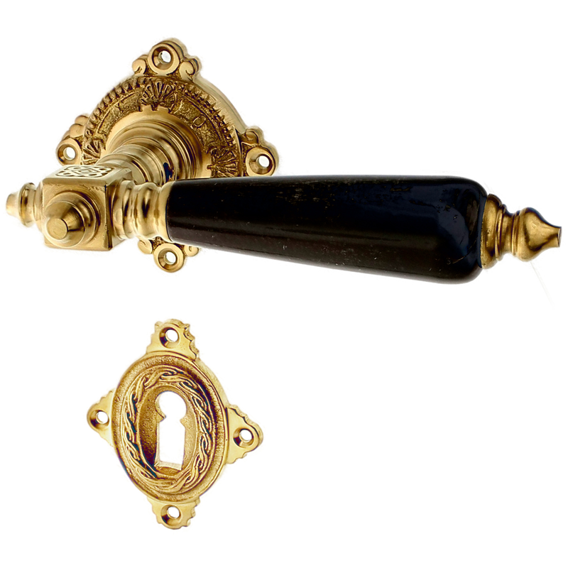 Rosettengarnitur mit Buntbart-Schlüsselloch. Egal, welchen Abstand das Schlüsselloch von der Türklinke hat, diese Garnitur passt in jedem Fall auch an Ihre historische Tür. Für WC-Verschlüsse bieten wir zusätzlich auch noch spezielle Einsteckschlösser an, falls Ihre Tür noch kein WC-Schloss hat. Schauen Sie bitte hier.