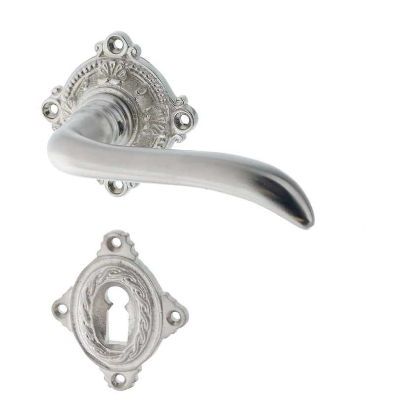 Rosettengarnitur mit Buntbart-Schlüsselloch. Egal, welchen Abstand das Schlüsselloch von der Türklinke hat, diese Garnitur passt in jedem Fall auch an Ihre historische Tür. Für WC-Verschlüsse bieten wir zusätzlich auch noch spezielle Einsteckschlösser an, falls Ihre Tür noch kein WC-Schloss hat. Schauen Sie bitte hier.