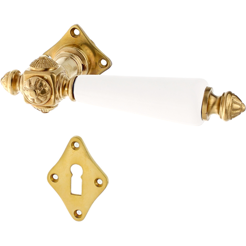 Rosettengarnitur mit Buntbart-Schlüsselloch. Egal, welchen Abstand das Schlüsselloch von der Türklinke hat, diese Garnitur passt in jedem Fall auch an Ihre historische Tür. Für WC-Verschlüsse bieten wir zusätzlich auch noch spezielle Einsteckschlösser an, falls Ihre Tür noch kein WC-Schloss hat. Schauen Sie bitte hier.