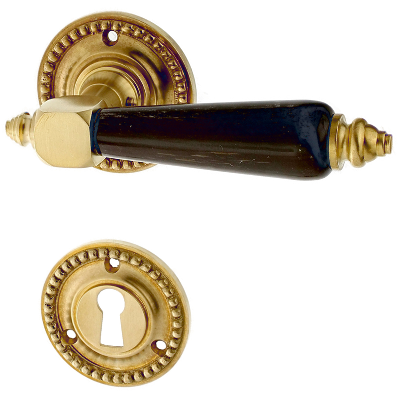 Rosettengarnitur mit Buntbart-Schlüsselloch. Egal, welchen Abstand das Schlüsselloch von der Türklinke hat, diese Garnitur passt in jedem Fall auch an Ihre historische Tür. Für WC-Verschlüsse bieten wir zusätzlich auch noch spezielle Einsteckschlösser an, falls Ihre Tür noch kein WC-Schloss hat. Schauen Sie bitte hier.