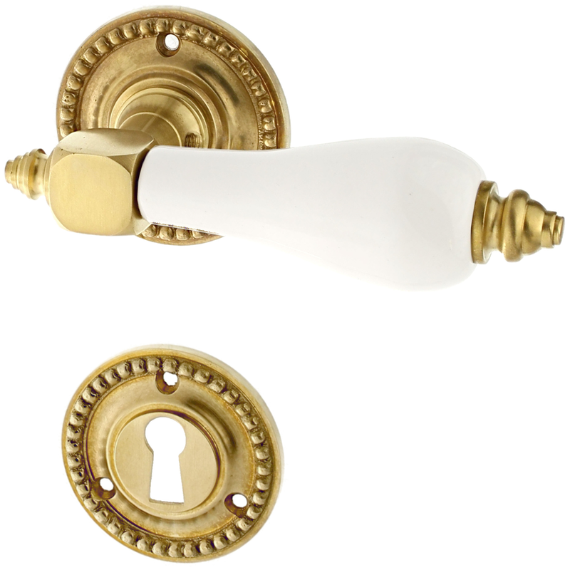 Rosettengarnitur mit Buntbart-Schlüsselloch. Egal, welchen Abstand das Schlüsselloch von der Türklinke hat, diese Garnitur passt in jedem Fall auch an Ihre historische Tür. Für WC-Verschlüsse bieten wir zusätzlich auch noch spezielle Einsteckschlösser an, falls Ihre Tür noch kein WC-Schloss hat. Schauen Sie bitte hier.