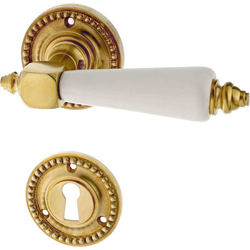 Rosettengarnitur mit Buntbart-Schlüsselloch. Egal, welchen Abstand das Schlüsselloch von der Türklinke hat, diese Garnitur passt in jedem Fall auch an Ihre historische Tür. Für WC-Verschlüsse bieten wir zusätzlich auch noch spezielle Einsteckschlösser an, falls Ihre Tür noch kein WC-Schloss hat. Schauen Sie bitte hier.