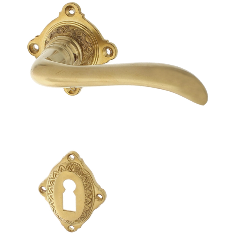 Rosettengarnitur mit Buntbart-Schlüsselloch. Egal, welchen Abstand das Schlüsselloch von der Türklinke hat, diese Garnitur passt in jedem Fall auch an Ihre historische Tür.