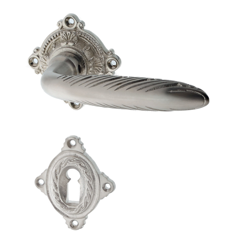 Rosettengarnitur mit Buntbart-Schlüsselloch. Egal, welchen Abstand das Schlüsselloch von der Türklinke hat, diese Garnitur passt in jedem Fall auch an Ihre historische Tür. Für WC-Verschlüsse bieten wir zusätzlich auch noch spezielle Einsteckschlösser an, falls Ihre Tür noch kein WC-Schloss hat. Schauen Sie bitte hier.