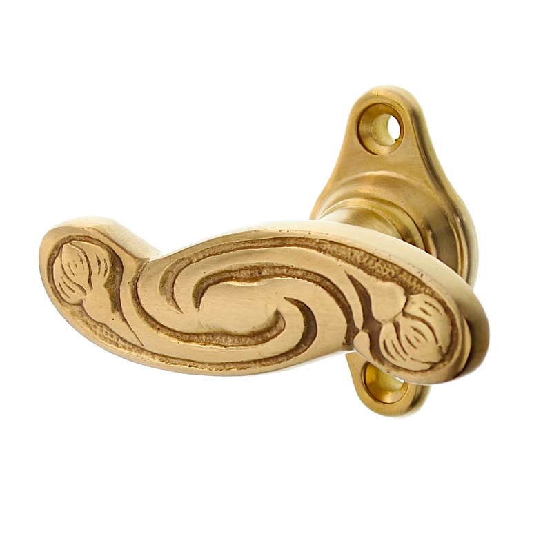 Die klassische Linienführung dieses Fenstergriffs unterstreicht die Form und Bestimmung dieser Vollolive. Das hochwertige Messing verleiht durch seine Farbe den Volloliven eine ganz individuelle Note.