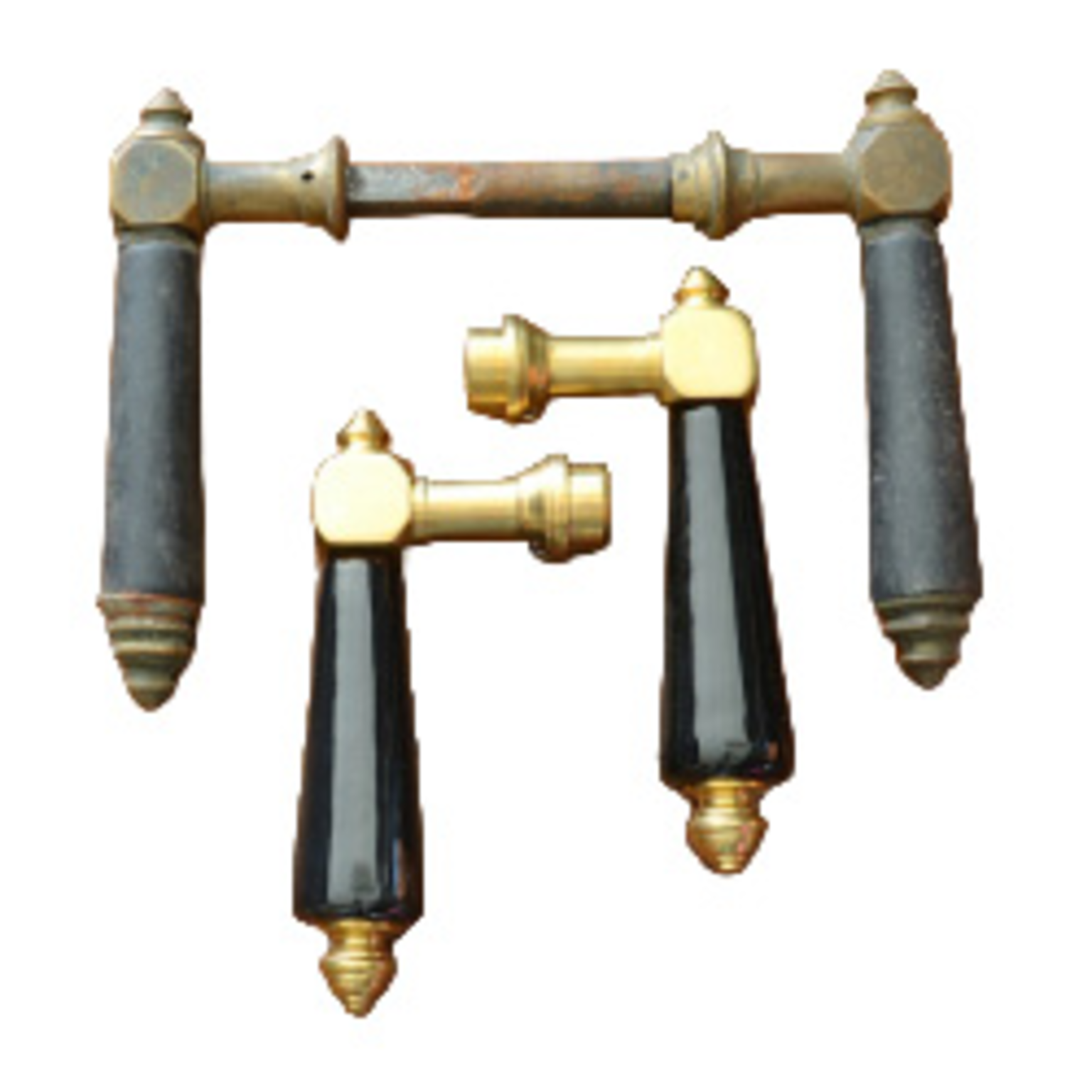 Der Nachguss dieser Türklinken ermöglicht, anders als beim historischen Original den Einsatz mit verschiedenen Handhaben aus Keramik, Holz oder Horn.