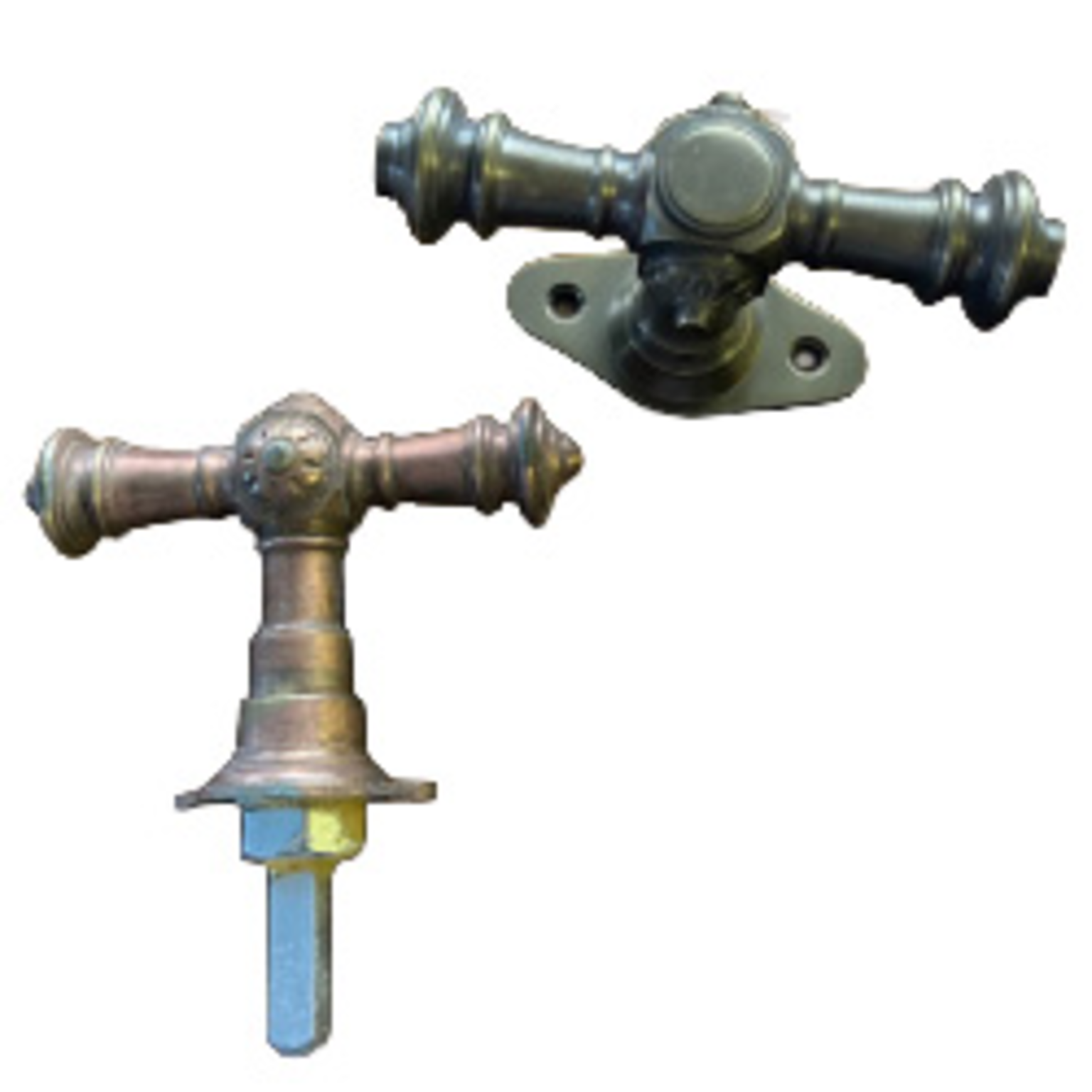 Die Form dieser Vollolive aus Messing massiv stammt aus dem späten Jugendstil. Beim Nachguss wurde die Mechanik den modernen Standards angepasst, sodass sie heute wieder an verschiedensten Fenstern montiert werden kann.