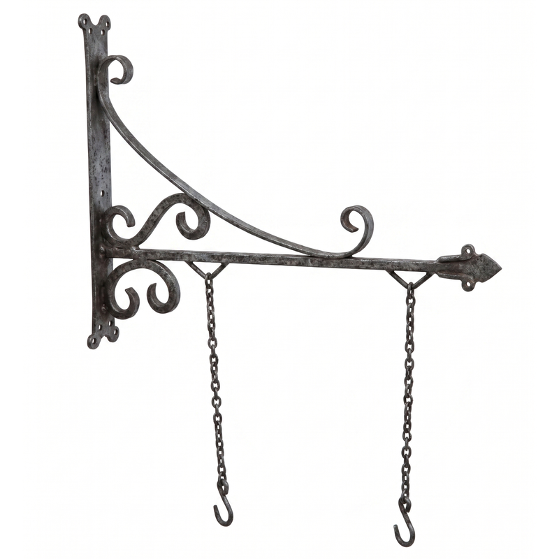 Schilderhalter antik | Historischer Wandwinkel | Handarbeit, Eisen schwarz, IRF-EW029, 42 cmAuch wenn um die Wende des 19. zum 20. Jahrhundert Schmiedeeisen in vielen Bereichen durch die Erfindung des Gusseisens stark zurückgedrängt wurde, besitzen handgeschmiedete Beschläge nicht nur in Stilbauten, historischen Gebäuden und der Denkmalpflege hohe Bedeutung. Die frühesten noch erhaltenen Funde von Beschlägen aus Eisen dokumentieren eindrucksvoll nicht nur die Schmiedekunst jener Zeit, sondern auch die besonderen Eigenschaften von handgeschmiedeten Eisenbeschlägen: Hohe Festigkeit, gute Formbarkeit, günstiger Preis und lange Lebensdauer.
